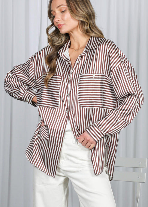 Long Sleeve Pocket Detail Striped Satin Shirt